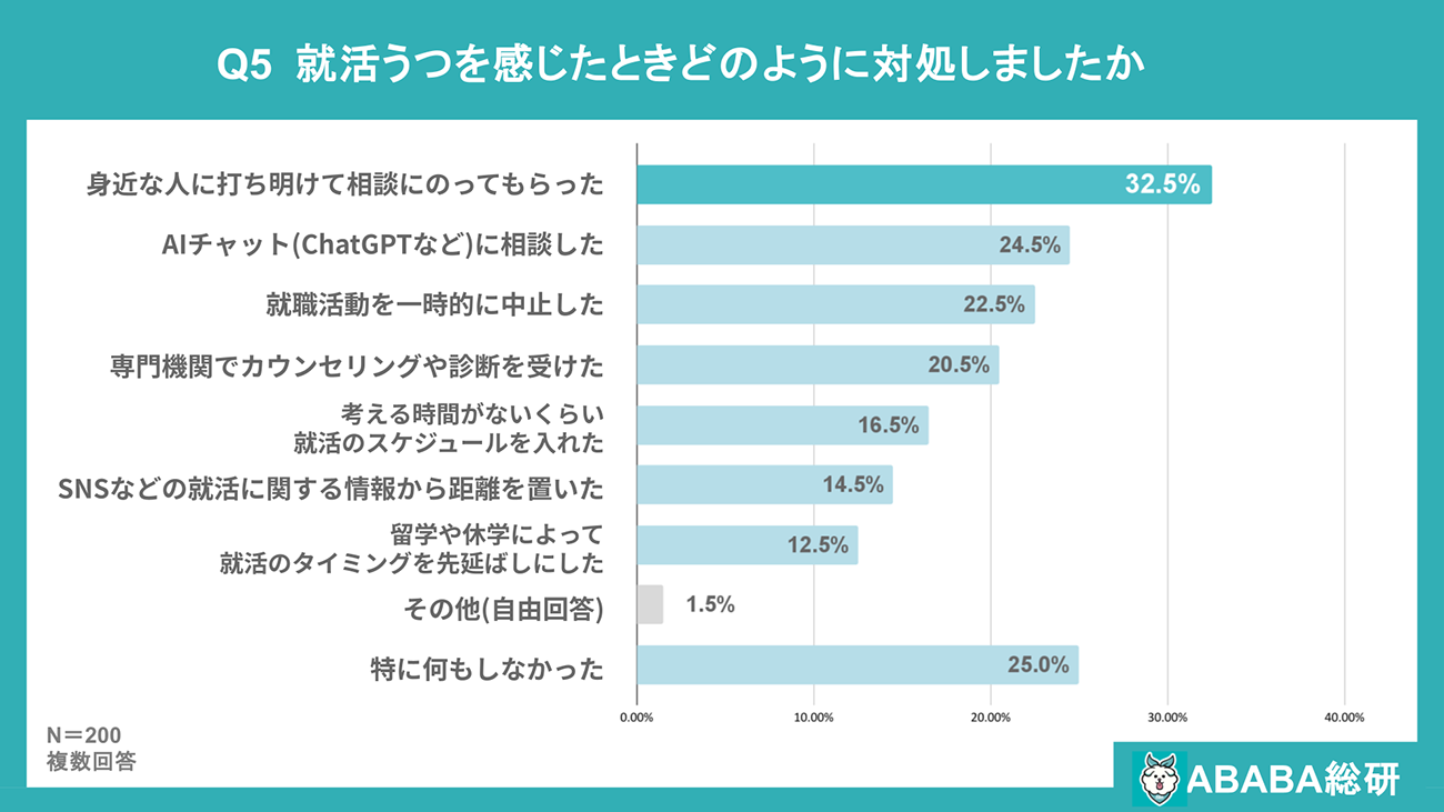 さらに、「AIチャット(ChatGPTなど)に相談した」(24.5%)、「就職活動を一時的に中止した」(22.5%)、「専門機関でカウンセリングや診断を受けた」(20.5%)、「考える時間がないくらい就活のスケジュールを入れた」(16.5%)、「SNSなどの就活に関する情報から距離を置いた」(14.5%)、「留学や休学によって就活のタイミングを先延ばしにした」(12.5%)がそれに続いた。