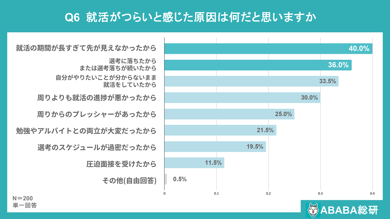 就活がつらいと感じた原因としては(複数回答)、「就活の期間が長すぎて先が見えなかったから」(40.0%)が最多となっている。続いて「選考に落ちたから、または選考落ちが続いたから」(36.0%)、「自分がやりたいことが分からないまま就活をしていたから」(33.5%)が上位となっている。また、「周りよりも就活の進捗が悪かったから」(30.0%)、「周りからのプレッシャーがあったから」(25.0%)といった回答もある。