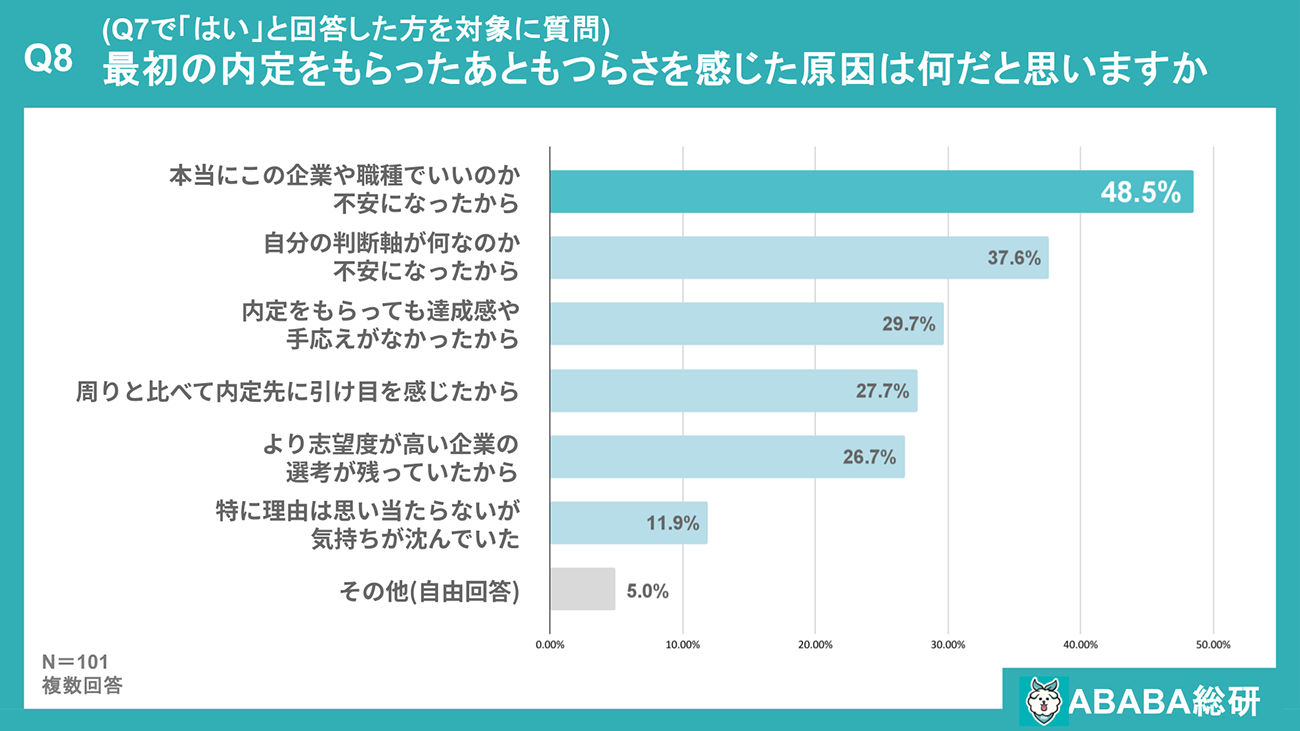 最初の内定獲得後も就活うつっぽいと感じていた人に、その原因として思い当たるものを尋ねたところ(複数回答)、「本当にこの企業や職種でいいのか不安になったから」(48.5%)がもっとも多い。以下、「自分の判断軸が何なのか分からなくなっていたから」(37.6%)、「内定をもらっても達成感や手応えがなかったから」(29.7%)、「周りと比べて内定先に引け目を感じたから」(27.7%)、「より志望度が高い企業の選考が残っていたから」(26.7%)、「特に理由は思い当たらないが気持ちが沈んでいた」(11.9%)がそれに続いた。
