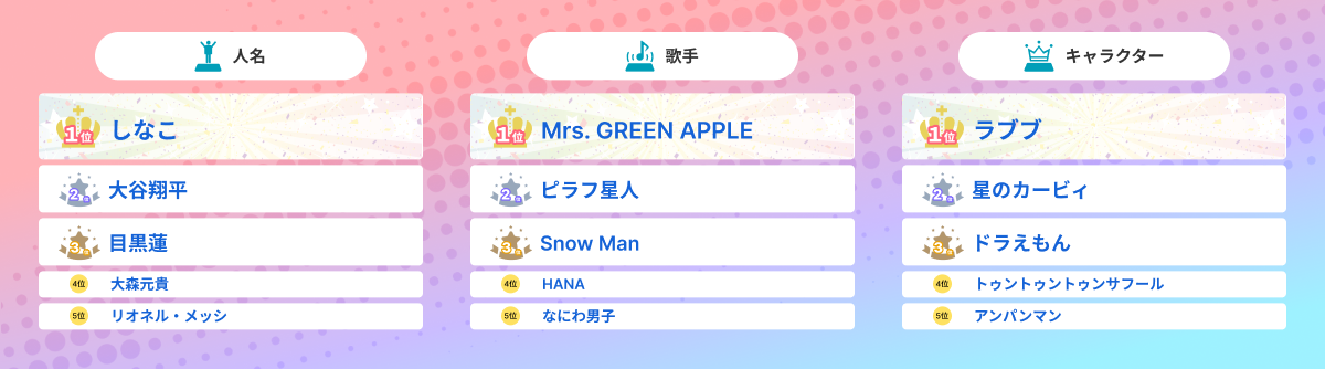 画像検索ランキングでは、人名部門で原宿系クリエイター「しなこ」が1位を獲得し、2024年に1位だった「大谷翔平」は2位にランクインしている。歌手部門では「Mrs. GREEN APPLE」「Snow Man」「なにわ男子」など、若年層に人気のアーティストが上位となっている。キャラクター部門では、「ラブブ」が1位となった。