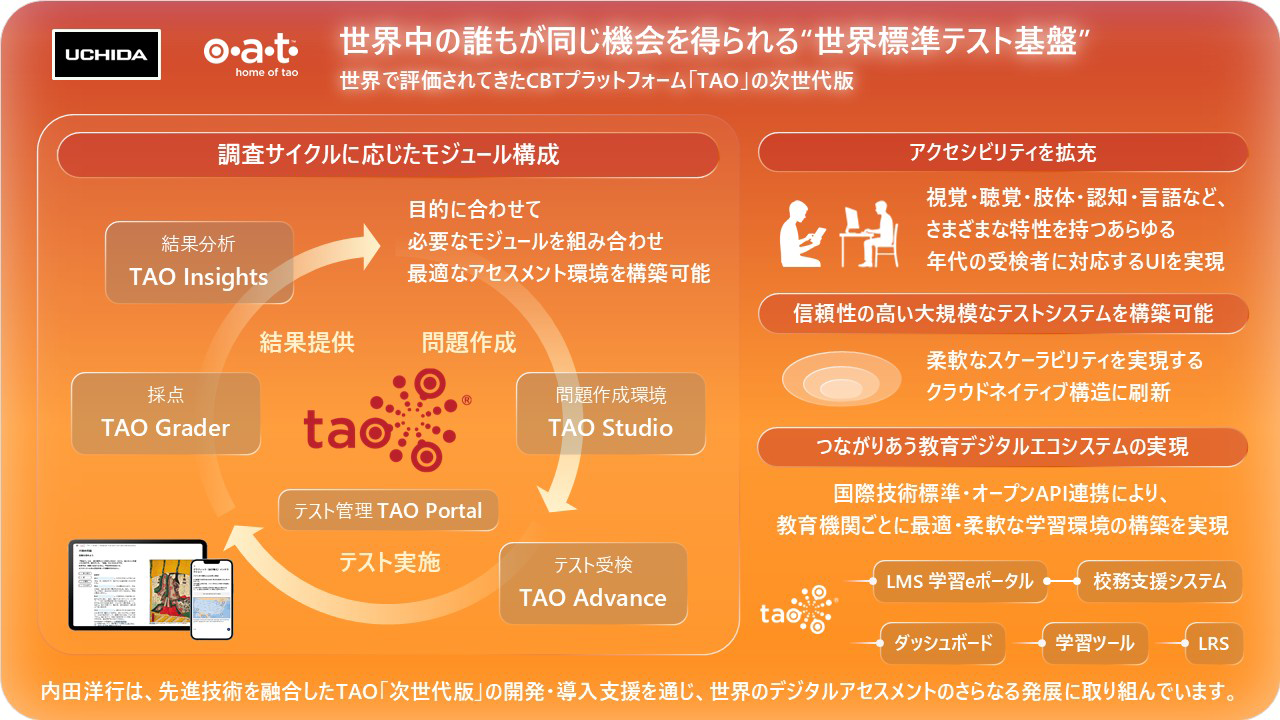 「TAO」は、オープンスタンダードな技術を採用し、CBTシステムをネットワーク上で実現することを目指して、2002年から研究と活用が続けられてきたシステム。日本では、内田洋行がOATと2016年から連携して国内でのCBT環境整備を進め、2020年には文部科学省CBTシステム「MEXCBT(メクビット)」に「TAO」が採用された。