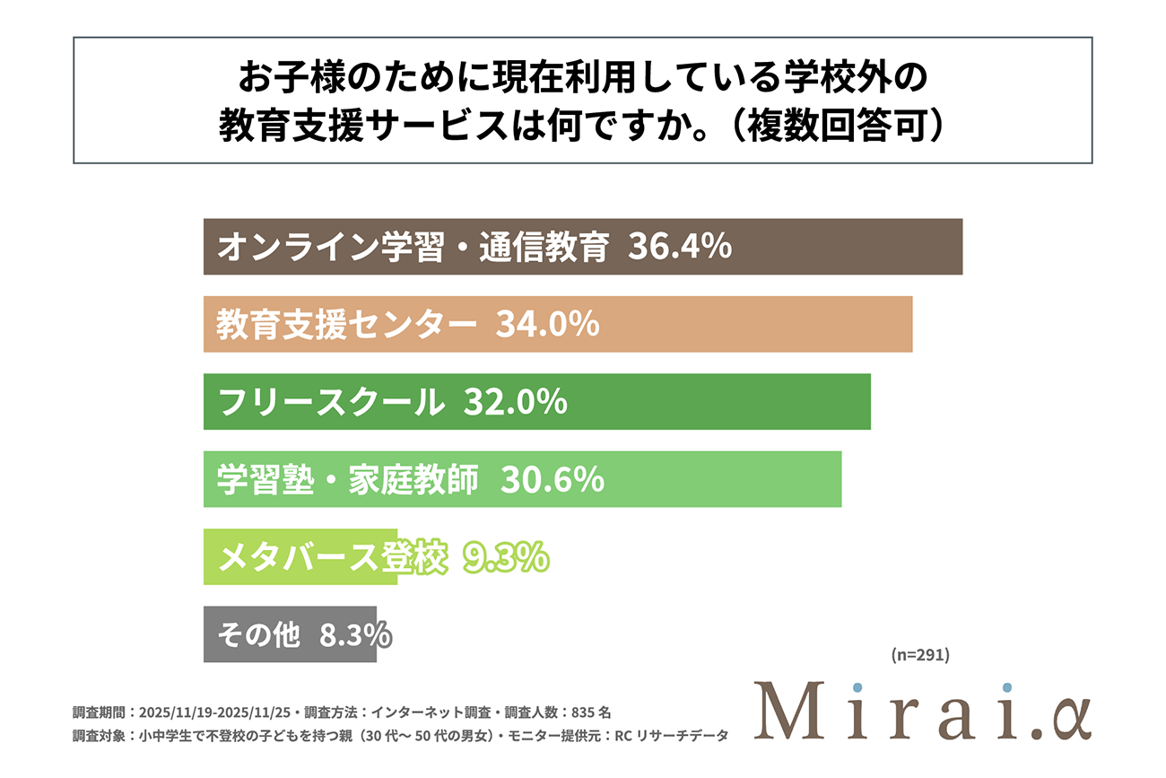不登校の子どものために何らかの学校外の教育支援サービスを利用している人に、その内容を尋ねたところ(複数回答)、「オンライン学習・通信教育」(36.4%)がもっとも多い。以下、「教育支援センター」(34.0%)、「フリースクール」(32.0%)が続いている。