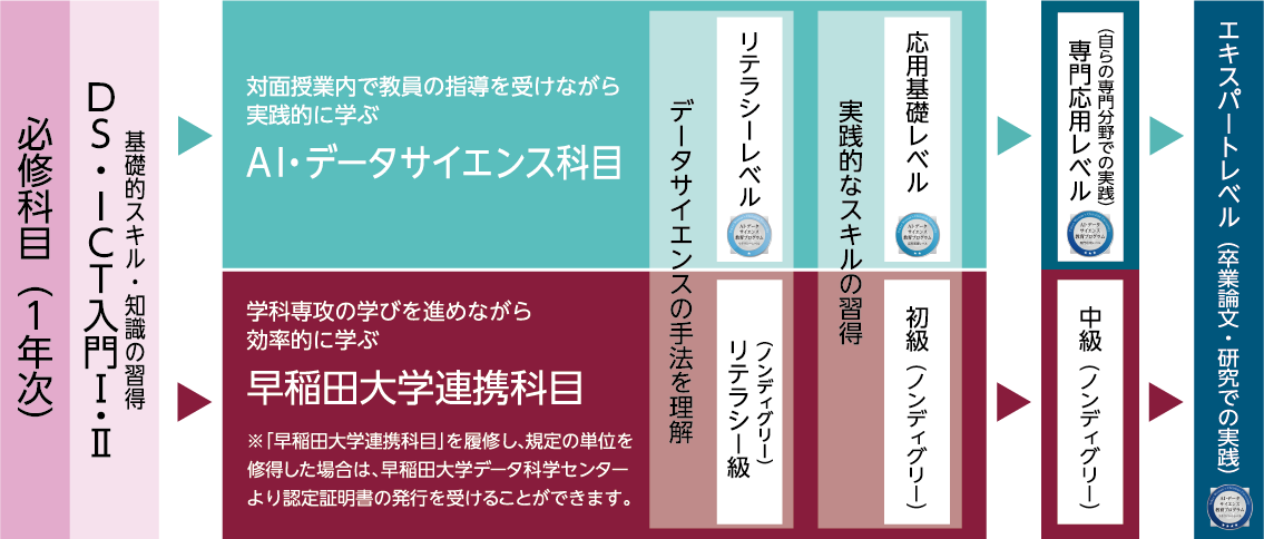 1年次必修科目を終えると、次に「AI・データサイエンス科目」(対面授業)または「早稲田大学連携科目」(オンデマンド授業)という選択科目へと進むが、後者の授業がユニークである。これは、早稲田大学データ科学センターのオンデマンド教材の一部を導入したものだが、そこに至る道は平坦ではなかった。
