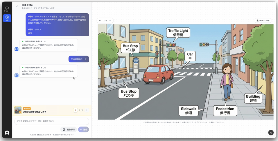 「画像生成Pro」では、学校現場でよく求められるイラスト・図解・教材素材の生成を、簡単かつ高品質に実現する。