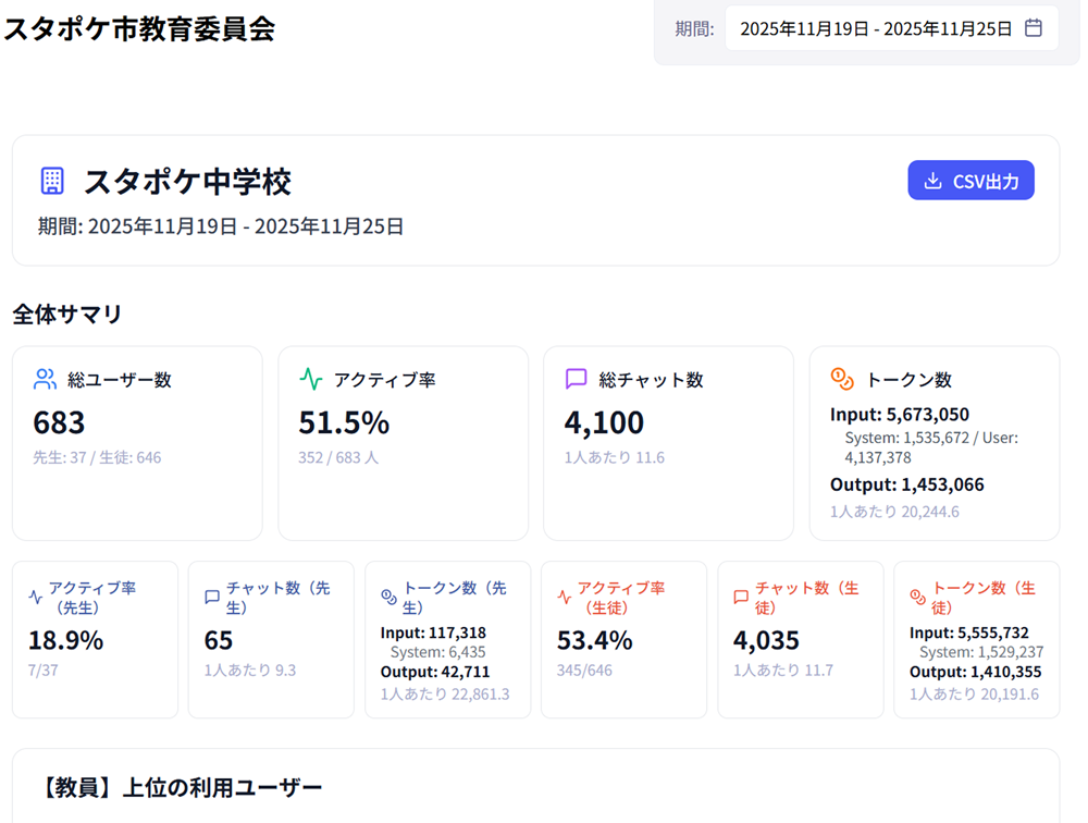 「校内AI利用状況分析」は、校内の教員たちがどの程度AIを活用しているかを可視化できるダッシュボード機能となる。