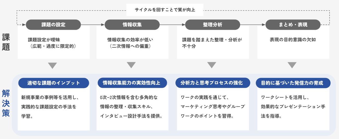 同社は、こうした現場の状況を踏まえ、探究活動における「課題設定の曖昧さ」や「情報収集・分析の形骸化」「まとめ・表現の目的意識の欠如」といった、学習サイクル全体の質に関する課題が顕在化していると認識。質の高い探究活動を実現するには、適切な課題設定や仮説思考を起点とし、体系的な指導プロセスが不可欠であるとしている。「探究プラス」は、これらの課題を解決するためのワンストップ支援サービスとして開発された。