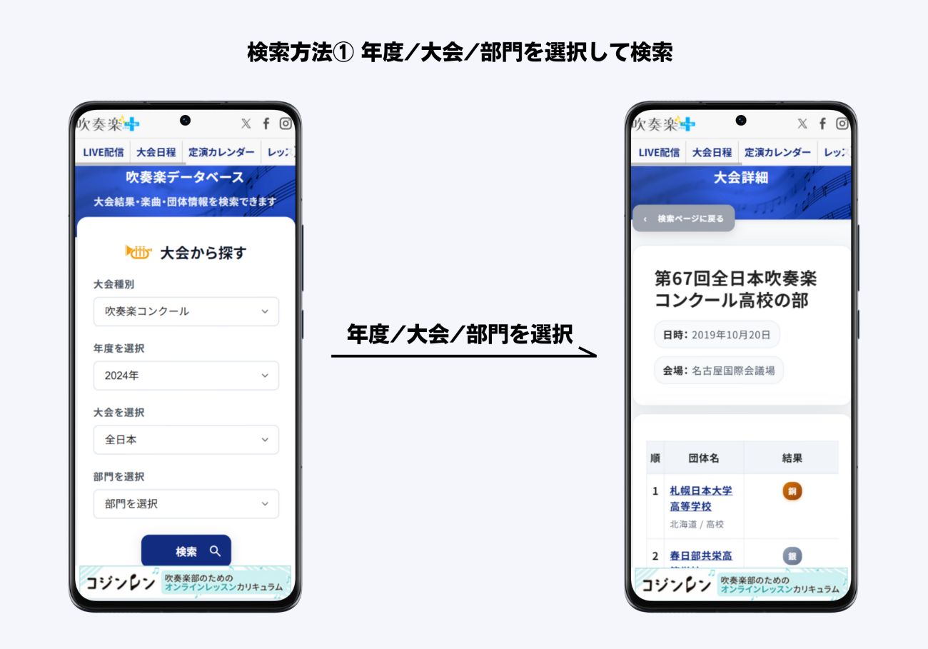 「吹奏楽データベース」は、同社が全日本吹奏楽連盟とともに主催してきた吹奏楽コンクールの歴史をさかのぼって調べることができるツール。曲名や団体名で検索を行うと、これまでの全日本吹奏楽コンクールにおける演奏記録や団体情報が表示される仕組みとなっている。