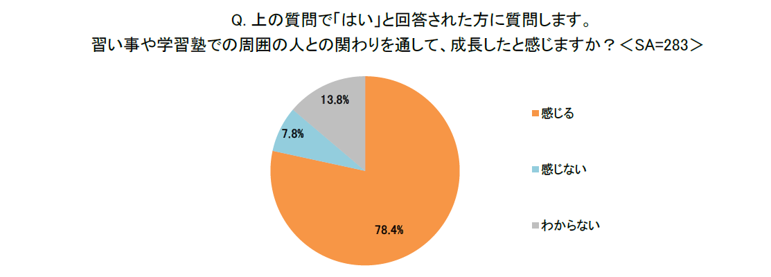 子どもに学校外活動の経験が「ある」と答えた人に、習い事や学習塾での周囲の人との関わりを通して、子どもは成長したと感じるかを尋ねた質問では、「感じる」という回答が約8割となっている。