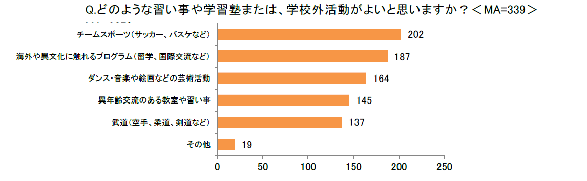 どのような習い事や学習塾、または学校外活動がよいと思うかを尋ねたところ(複数回答)、「チームスポーツ(サッカー、バスケなど)」がもっとも多く、「海外や異文化に触れるプログラム(留学、国際交流など)」「ダンス・音楽や絵画などの芸術活動」がそれに続いた。