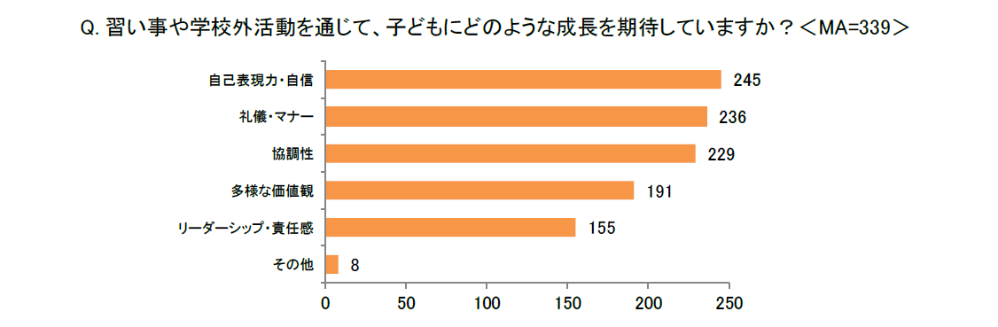 習い事や学校外活動を通じて、子どもにどのような成長を期待しているかを尋ねたところ(複数回答)、「自己表現力・自信」が最多となり、「礼儀・マナー」がそれに続いた。