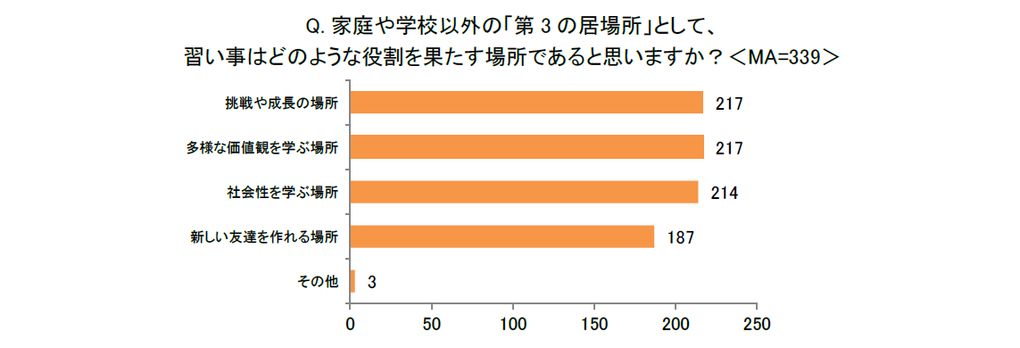 家庭や学校以外の「第3の場所」として、習い事はどのような役割を果たす場所だと思うかを尋ねたところ(複数回答)、「挑戦や成長の場所」と「多様な価値観を学ぶ場所」が同率で最多となっている。さらに、「社会性を学ぶ場所」がそれに続いた。