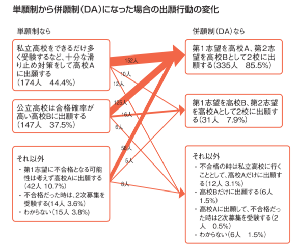 さらに、第1志望だが合格が難しいといわれている「公立高校A」と、合格の可能性が高い「公立高校B」があると仮定して、単願制から併願制(DA)になった場合の出願行動の変化を尋ねた。その回答として、単願制なら「公立高校は合格確率が高い高校Bに出願する」と答えた人の約85%が、併願制(DA)なら「第1志望を高校A、第2志望を高校Bとして、2校に出願する」と答えている。これにより、併願制(DA)になると難度の高い高校Aを第1志望として受験する人が、大幅に増えそうなことが明らかになった。