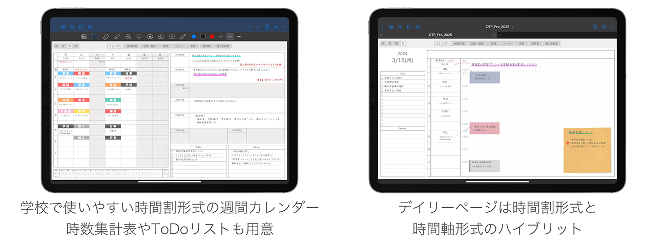 同製品は、紙の教師手帳と同様に、週間カレンダーと日間カレンダー部分が時間割形式となっている。そのため、週案の作成がしやすい。
