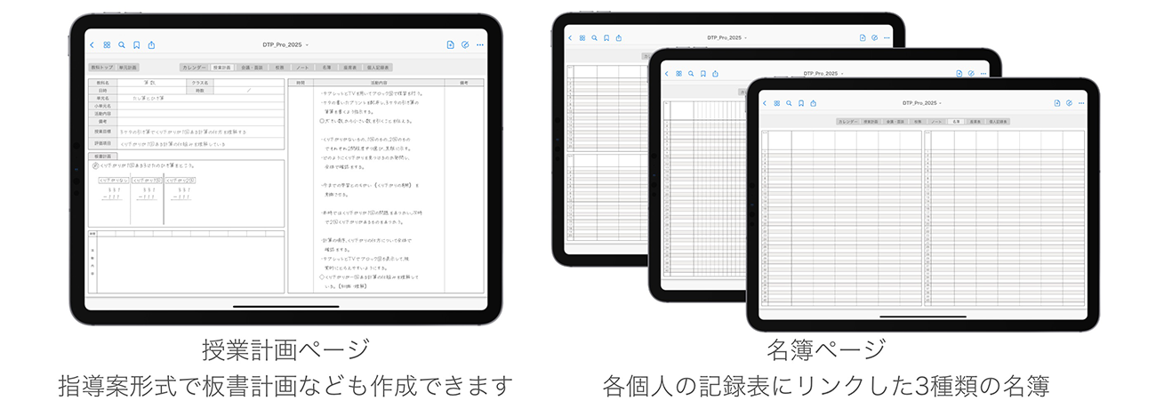 Pro版では、スケジュール管理だけでなく授業計画や名簿、座席表、児童生徒個人記録表、校務別スケジュール、会議ノートなども用意している。紙の手帳では管理しきれなかった内容までもiPad上でまとめらるため、情報を一元化でき作業効率の向上につながる。