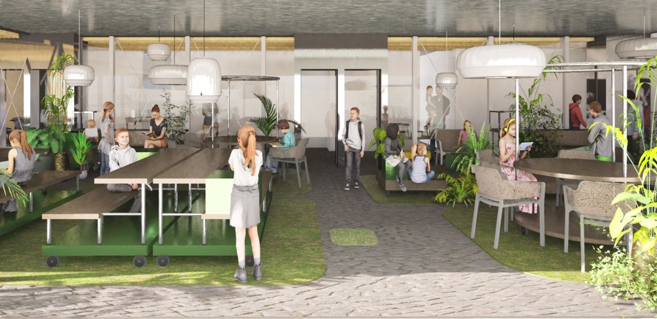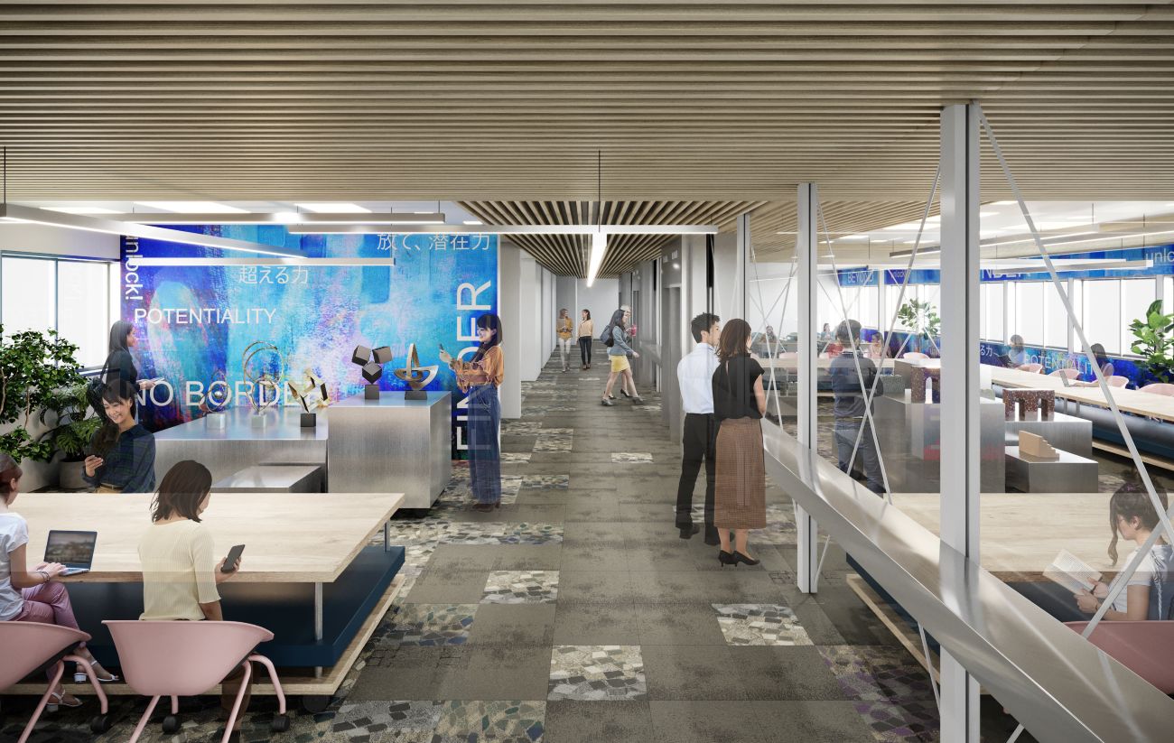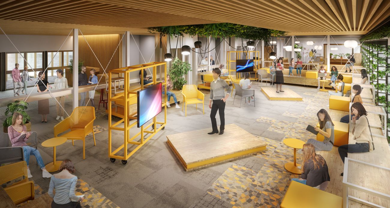 校舎の空間デザインでは「NO BORDER(境界のない学び)」「STIMULATION(刺激に満ちた空間)」「POTENTIALITY(可能性を広げる場)」という3つの視点をもつ。学校と社会の境界を取り払って学びが社会と地続きになるよう設計されている。