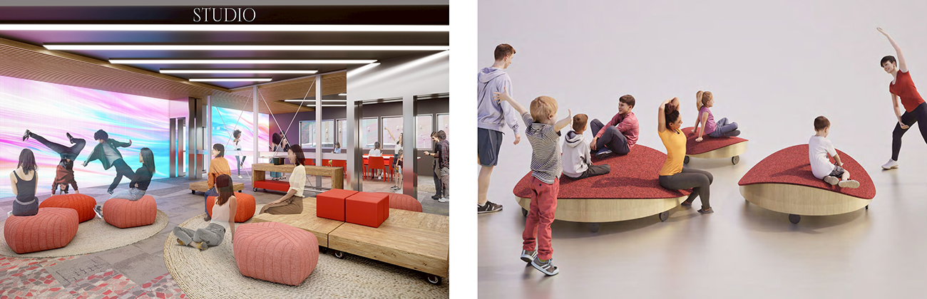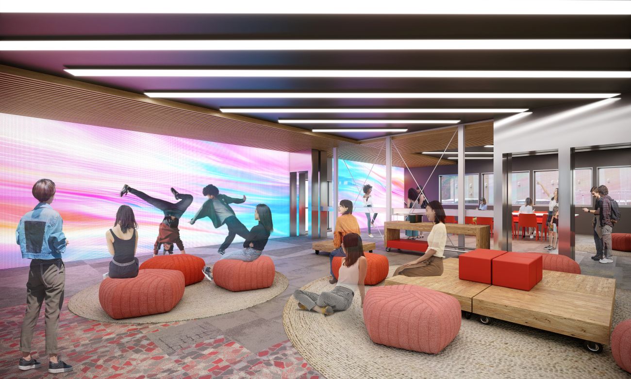 FINDER STUDIOは、壁一面に大型LEDビジョンを配したプロ仕様のクリエイティブスタジオとなる。ダンスや演劇のパフォーマンス、映像制作、オンライン配信といった、デジタルデバイスを駆使した表現活動に使用される。また、保護者向け説明会や産学連携イベントといった、社会に向けたアウトプットの場としても機能する。