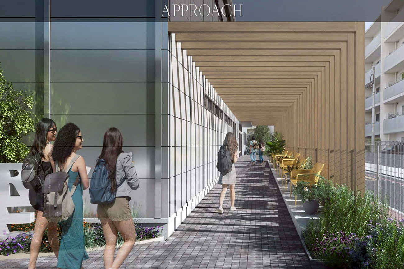 FINDER GATEは、朝日が差し込むパーゴラ型ゲートが象徴的なエントランスで、登校を「始動・出発」として演出する。