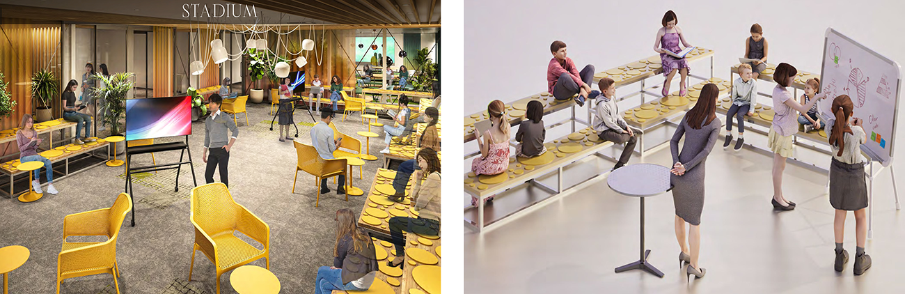 FINDER STADIUMは、最大60名を収容できる階段状のベンチを備えたスタジアム型空間となる。授業だけでなく、TEDのようなプレゼンテーションやディスカッションも行われる。ガラス越しに外部からも視認可能となり、ほどよい緊張感の中で「発信する力」と「表現する力」を養う。