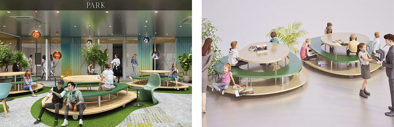 FINDER PARKは、公園のように自由な発想で過ごせるラウンジスペースとなる。可動式の家具を組み合わせて、グループワークや放課後の自習、生徒同士の語らいといった、目的のない余白の時間から偶発的なコミュニケーションを生み出す。