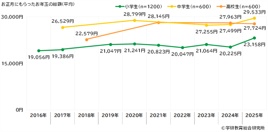 調査対象者に、今年(2025年)のお正月にもらったお年玉の総額を尋ねたところ、小学生では平均2万3158円、中学生では平均2万9533円、高校生では平均2万7724円だった。前回調査と比較すると、小学生では2933円増、中学生では2034円増、高校生では239円減となっている。