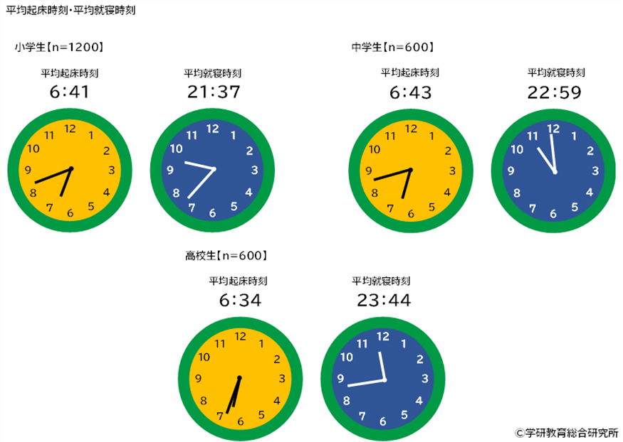 普段、夜は何時頃に寝ているかを尋ねたところ、小学生では「21時1分〜21時30分」や「21時31分〜22時」を挙げる回答が多く、平均就寝時刻は21時37分となっている。中学生では「22時1分〜22時30分」「22時31分〜23時」「23時1分〜23時30分」「23時31分〜24時」を挙げる回答が多く、平均就寝時刻は22時59分となっている。高校生では「23時31分〜24時」「24時1分〜24時30分」「24時31分〜25時」が多く、平均就寝時刻は23時44分だった。