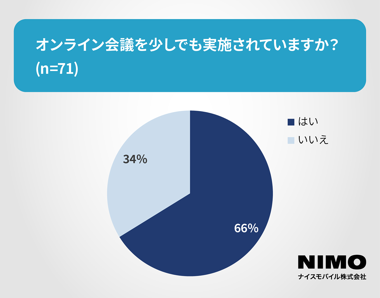 オンライン会議を少しでも実施しているかという質問では、「実施している」とする回答が66%に達している。