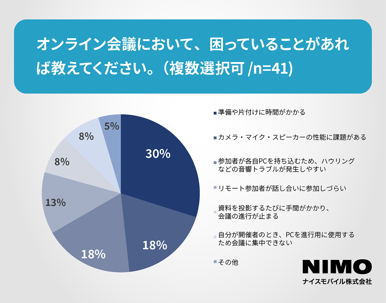 オンライン会議を「実施している」と答えた教育機関に、オンライン会議において困っていることを尋ねたところ(複数回答)、「準備や片付けに時間がかかる」(30%)、「カメラ・マイク・スピーカーの性能に課題がある」(18%)といった回答が上位を占めた。
