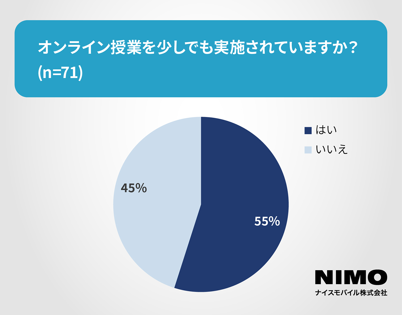 オンライン授業を少しでも実施しているかという質問では、「実施している」が55%に達している。