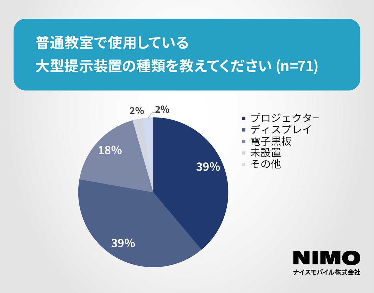 普通教室で使用している大型提示装置(電子黒板、パソコンなどの画面に表示した資料や写真などを投影するモニターやプロジェクターが含まれる)の種類についての質問では、「プロジェクター」や「ディスプレイ」(いずれも39%)が多く導入されていることが明らかになっている。
