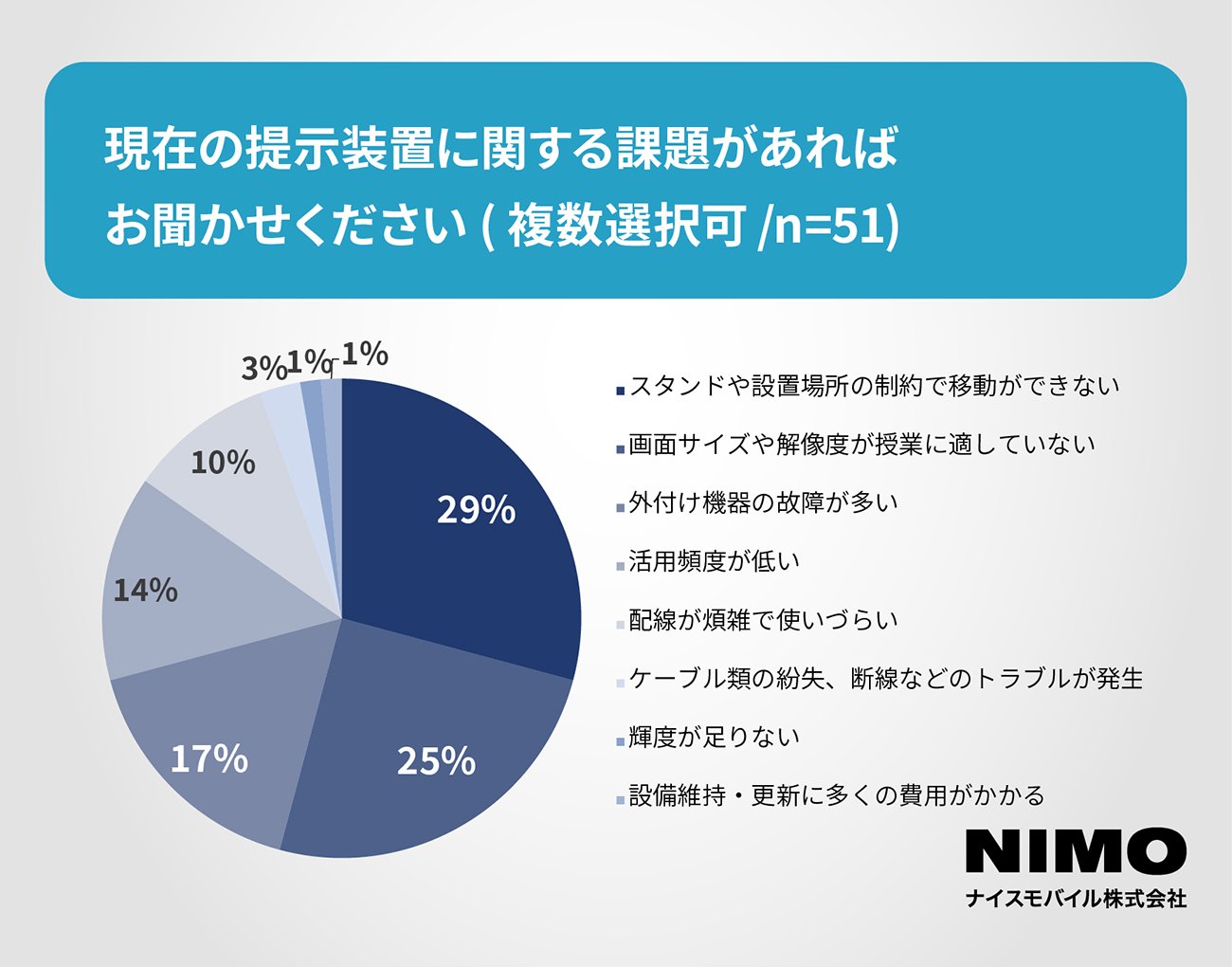 現在使用している大型提示装置に関する課題を尋ねたところ(複数回答)、「スタンドや設置場所の制約で移動ができない」(29%)という回答がもっとも多い。「画面サイズや解像度が授業に適していない」(25%)、「外付け機器の故障が多い」(17%)がそれに続いている。