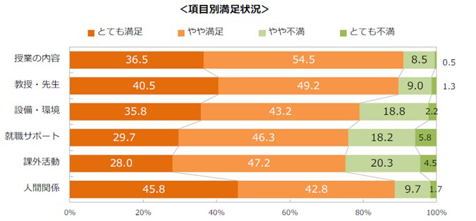 「とても満足」と「やや満足」を合わせた割合が高いのは、「授業の内容」(91.0%)、「教授・先生」(89.7%)の2項目で、いずれも約9割に達している。次に高いのは、「人間関係」の88.6%となっている。「設備・環境」は79.0%で、図書館や研究設備などの充実度が満足度に影響している。「就職サポート」は76.0%となり、親身に相談に乗ってもらえたおかげで満足のいく就職先が決まったという声がある一方、もう少し手厚いサポートを望む声もみられた。「課外活動」は75.2%と6項目の中でもっとも低く、コロナ禍の影響があると考えられる。