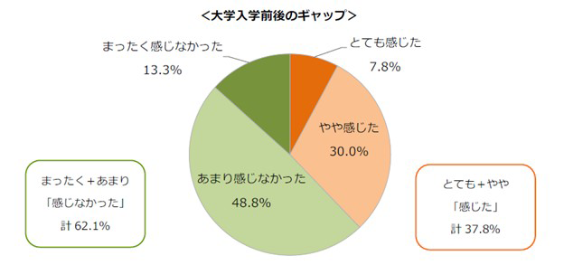 続いて、大学入学前後のギャップを尋ねた質問では、「とても感じた」(7.8%)と「やや感じた」(30.0%)を合わせた割合が37.8%に達している。調査対象者からのコメントによると、事前の情報収集不足がギャップに結びついているケースが多い。