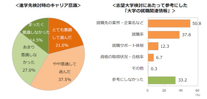 進学先検討時にキャリアを意識したかを尋ねたところ、「とても意識して選んだ」が21.0%、「やや意識して選んだ」が37.5%を占めた。5割超の学生が、将来のキャリアや就職を意識して進学先を選択したことがうかがえる。