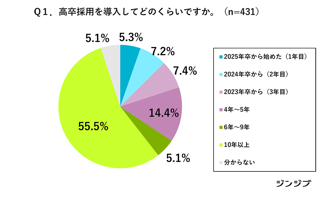 調査対象者に高卒採用の導入期間を尋ねたところ、「10年以上高卒採用を続けている」(55.5%)がもっとも多い。その一方で、ここ3年以内に高卒採用を導入したことを示す、「2023年卒から」「2024年卒から」「2025年卒から」という回答の合計は19.9%に達している。