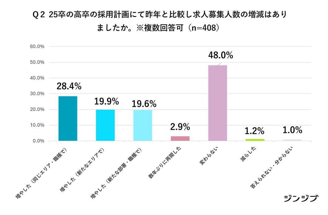 2025年卒の高卒採用計画における、前年と比べたときの求人募集人数の増減については(複数回答)、「変わらない」(48%)が最多となっている。募集人数を増やしたという回答では「同じエリア・職種で」(28.4%)のほか、「新たなエリアで」(19.9%)、「新たな部署・職種で」(19.6%)、「数年ぶりに再開した」(2.9%)があり、新たな採用枠もできている。
