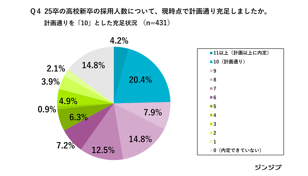 2025年卒の高校新卒の採用人数について、調査時点で計画通り充足したかという質問では、「計画通りに充足した」(20.4%)と「計画以上に採用できた」(4.2%)を合わせた割合が全体の約4分の1に達している。一方で、75.4%の企業は計画未達となっており、充足度が「5以下」が18.1%、「内定できていない」が14.8%と採用結果に差が生じた。