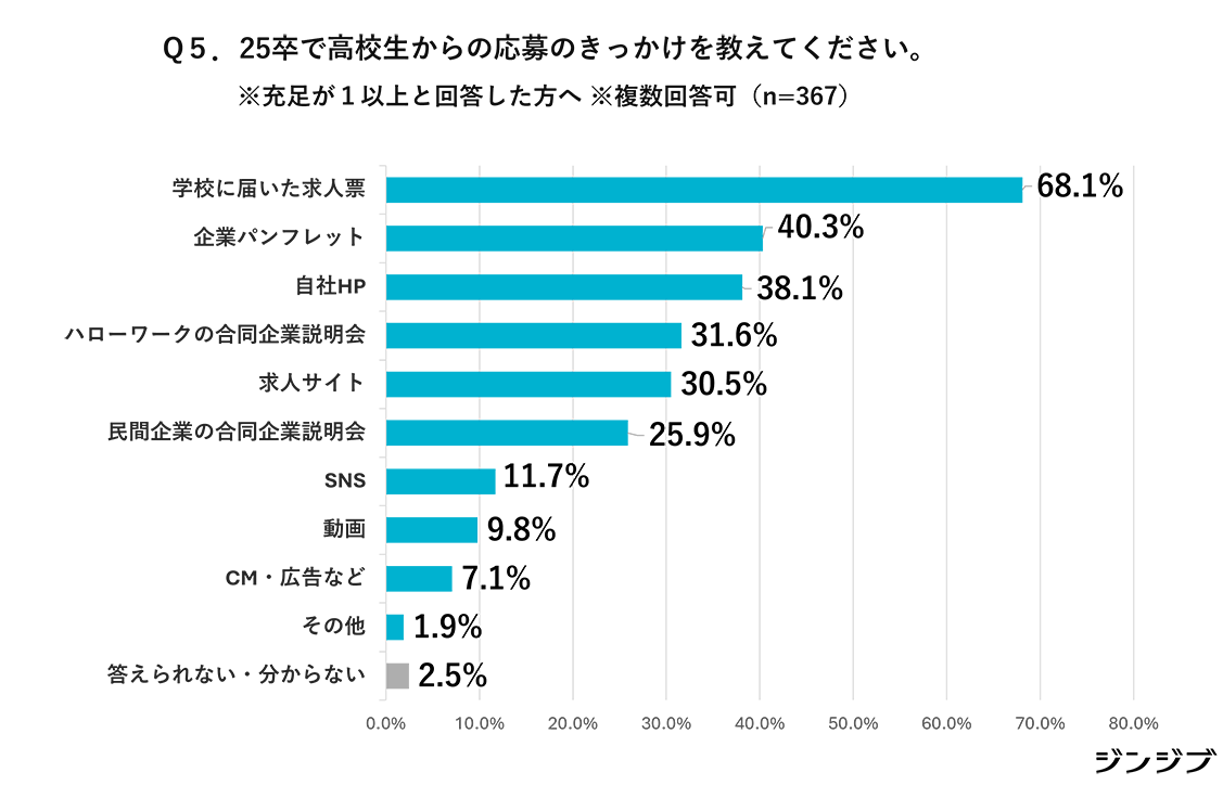 2025年卒の高校生からの応募のきっかけとしては(複数回答)、「学校に届いた求人票」(68.1%)が最多となっている。以下、「企業パンフレット」(40.3%)、「自社HP」(38.1%)、「ハローワークの合同企業説明会」(31.6%)、「求人サイト」(30.5%)が続いている。