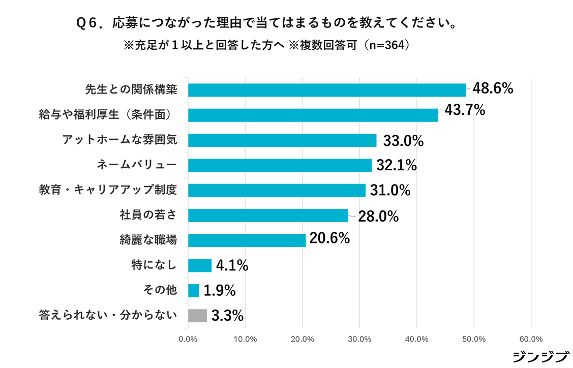 応募につながった理由を尋ねたところ(複数回答)、「教員との関係構築」(48.6%)がもっとも多い。「給与や福利厚生などの条件面」(43.7%)、「アットホームな雰囲気」(33.0%)、「ネームバリュー」(32.1%)、「教育・キャリアアップ制度」(31.0%)がそれに続いた。