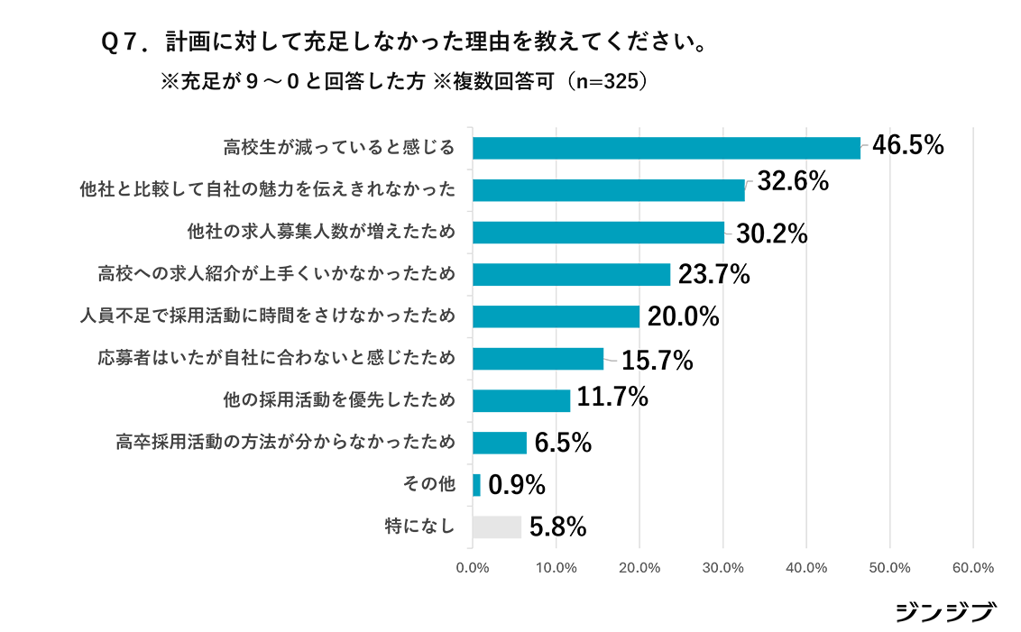2025年卒の高校新卒の採用人数が「充足しなかった」と答えた人に、その理由を尋ねたところ(複数回答)、「高校生が減っていると感じる」(46.5%)がもっとも多い。以下、「他社と比較して自社の魅力を伝えられなかった」(32.6%)、「他社の求人募集人数が増えたため」(30.2%)、「高校への求人紹介がうまくいかなかった」(23.7%)、「人員不足で採用活動に時間を割けなかった」(20.0%)が続いている。