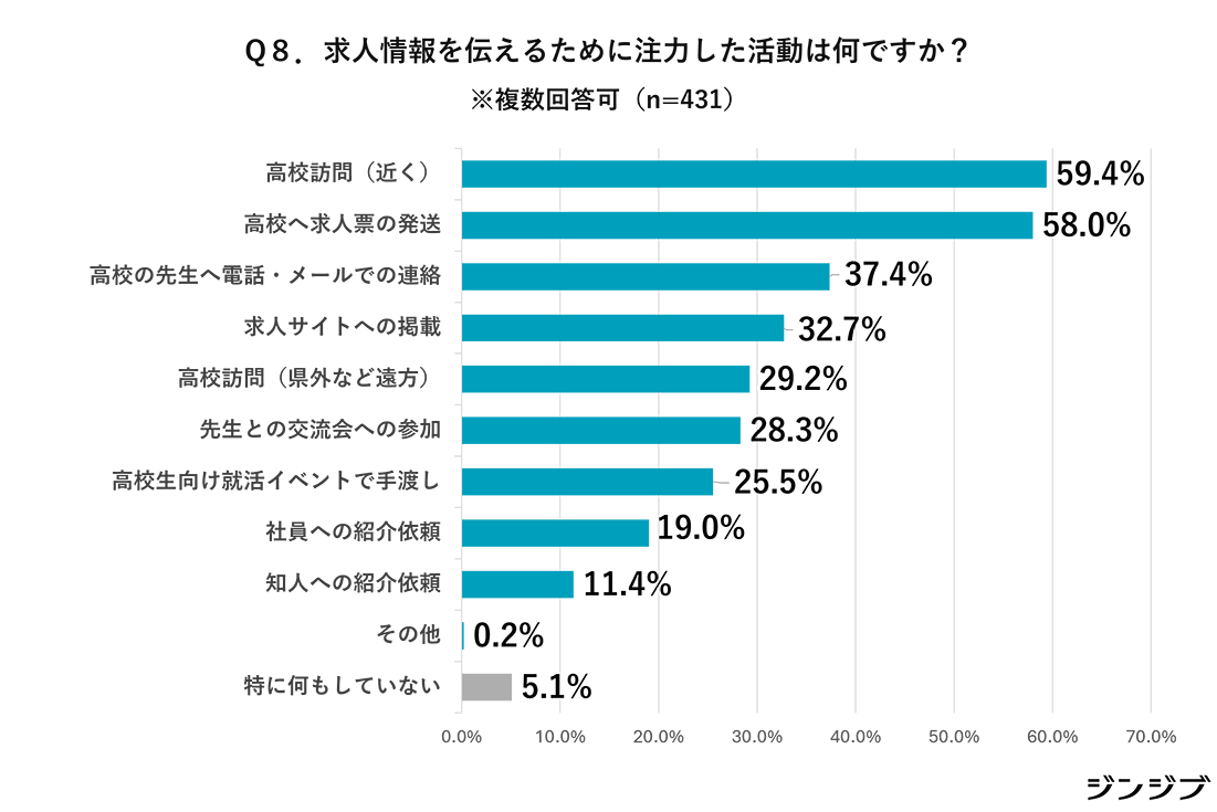 求人情報を伝えるために注力した活動としては(複数回答)、「高校訪問(近く)」(59.4%)が最多となっている。「高校へ求人票の発送」(58.0%)、「高校の教員へ電話・メールでの連絡」(37.4%)、「求人サイトへの掲載」(32.7%)、「高校訪問(県外など遠方)」(29.2%)、「教員との交流会への参加」(28.3%)がそれに続いた。なお、「特に何もしていない」という回答は5.1%に留まっている。