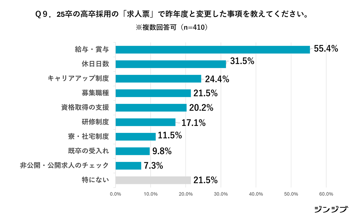 2025年卒の高卒採用での「求人票」で、前年度から変更した事項は(複数回答)、「給与・賞与」(55.4%)がもっとも多い。「休日日数」(31.5%)、「キャリアアップ制度」(24.4%)、「募集職種」(21.5%)、「資格取得の支援」(20.2%)がそれに続いた。なお、「特にない」の回答割合(21.5%)は、前年度の回答(33.8%)よりも減少している。