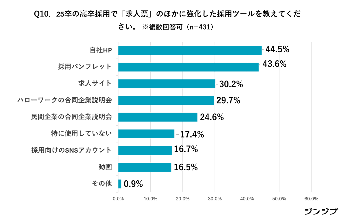 2025年卒の高卒採用で「求人票」のほかに強化した採用ツールとしては(複数回答)、「自社HP」(44.5%)と「採用パンフレット」(43.6%)が上位を占めている。そのほか、「求人サイト」(30.2%)や「民間企業の合同企業説明会」(24.6%)といった外部チャネルの活用を挙げる回答もみられた。一方で、「採用SNS」(16.7%)や「動画」(16.5%)はまだ少数派となっている。