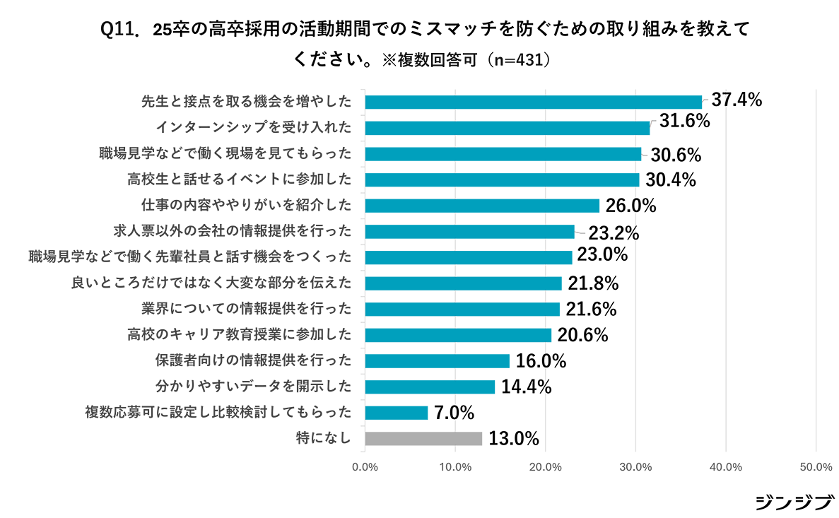 2025年卒の高卒採用の活動期間において、ミスマッチを防ぐ取り組みを尋ねたところ(複数回答)、「教員と接点を取る機会を増やした」(37.4%)が最多となっている。以下、「インターンシップを受け入れた」(31.6%)、「職場見学などで働く現場を見てもらった」(30.6%)、「高校生と話せるイベントに参加した」(30.4%)、「仕事の内容ややりがいを紹介した」(26.0%)、「求人票以外の情報提供を行った」(23.2%)がそれに続いた。