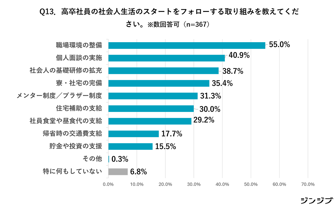 高卒社員による社会人生活のスタートをフォローする取り組みとしては(複数回答)、「職場環境の整備」(55.0%)が最多となっている。以下、「個人面談の実施」(40.9%)、「社会人の基礎研修の拡充」(38.7%)、「寮・社宅の完備」(35.4%)、「メンター制度」(31.3%)、「住宅補助の支給」(30.0%)、「社員食堂・昼食代の支給」(29.2%)が続いている。