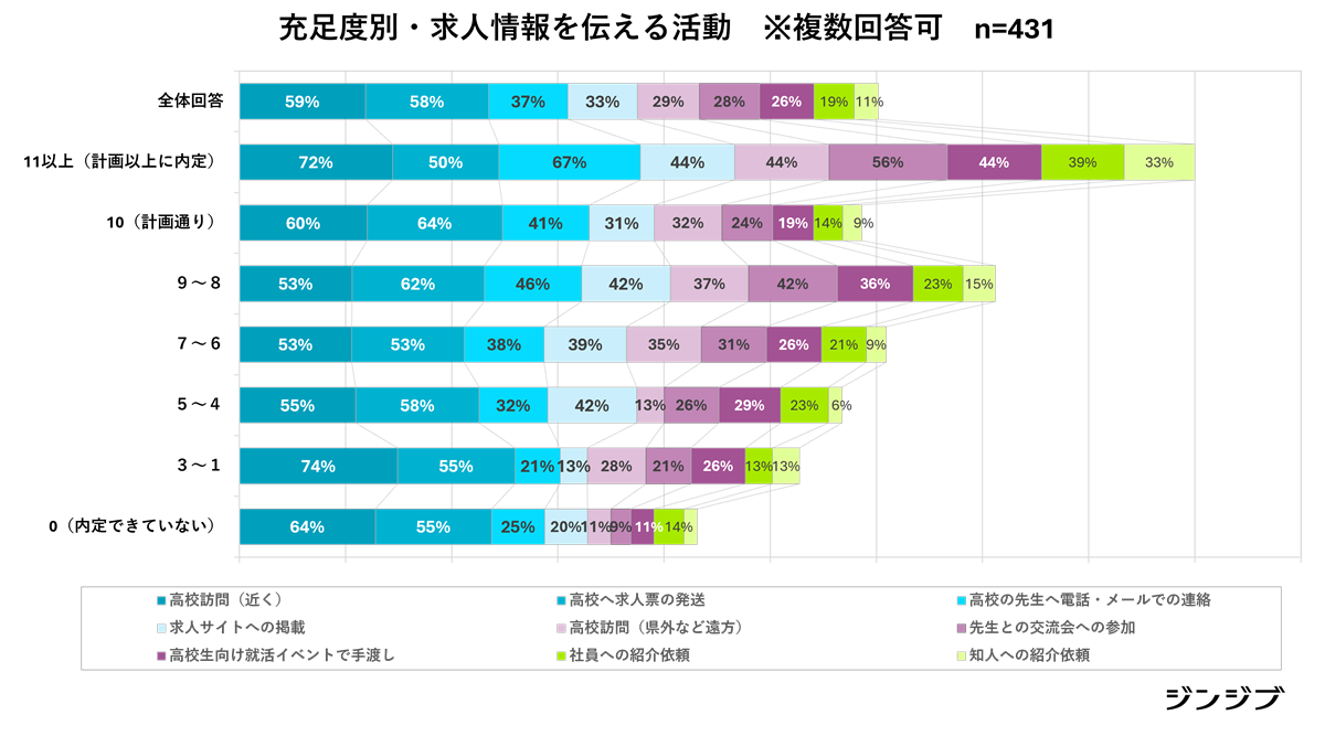 なおジンジブでは、2025年卒の高卒採用において採用充足度が高い企業の採用活動の傾向をみるため、「求人情報を伝える活動」「求人票の変更事項」「強化した採用ツール」に関するクロス集計を実施した。