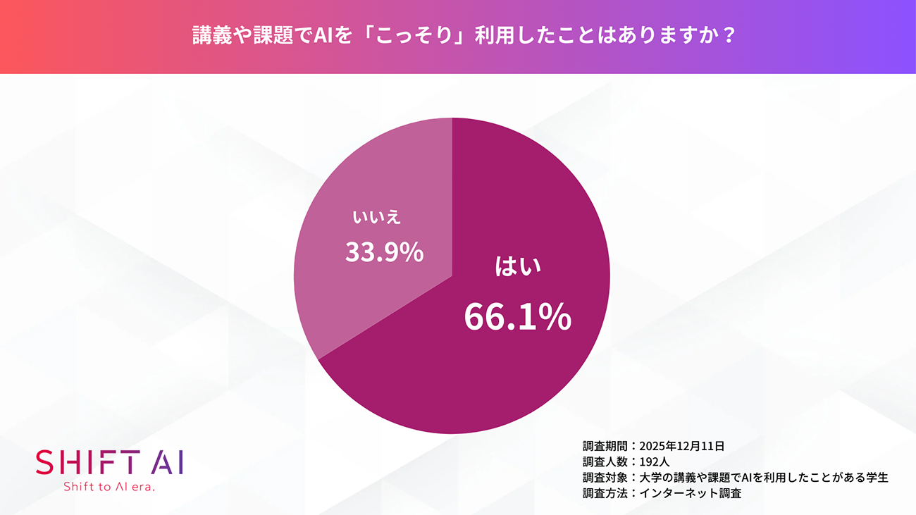 SHIFT AIは、大学の講義や課題でのAI利用経験がある全国の学生(大学・大学院・短大・専門学校)300名を対象に実施した、「AIを学校の講義や課題にこっそり利用」に関する調査の結果を2025年12月29日に発表した。同調査は、2025年12月11日に行われている。