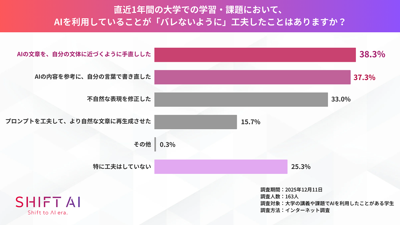 同じく、講義や課題でのAI利用経験がある学生に、直近1年間の大学での学習・課題において、AIの利用が「バレないように」工夫したことがあるかを尋ねたところ(複数回答)、「AIの文章を、自分の文体に近づくように手直しした」(38.3%)が最多となっている。「AIの内容を参考に、自分の言葉で書き直した」(37.3%)、「不自然な表現を修正した」(33.0%)、「プロンプトを工夫して、より自然な文章に再生成させた」(15.7%)がそれに続いている。一方で、「特に工夫はしていない」(25.3%)という回答も一定数みられる。