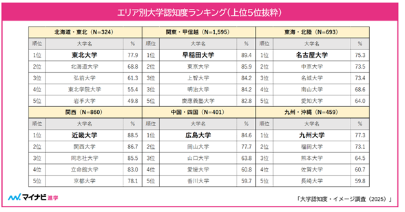 進学希望者の大学の認知度については、エリア別でみると関東・甲信越エリアでは前回2位だった早稲田大学が1位となり、関西エリアは近畿大学が4年連続で1位となった。北海道・東北エリアでは東北大学、中国・四国エリアでは広島大学が1位を獲得するなど、その他のエリアでは国立大学が上位にランクインしている。