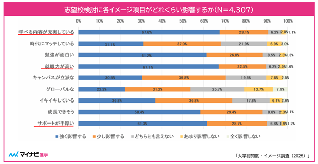 志望校の検討にあたって、それぞれのイメージ項目がどの程度影響するかを尋ねたところ、もっとも強い影響があるのは「学べる内容が充実している」(67.6%)となっている。以下、「就職力が高い」(67.1%)、「サポートが手厚い」(61.3%)が続いている。