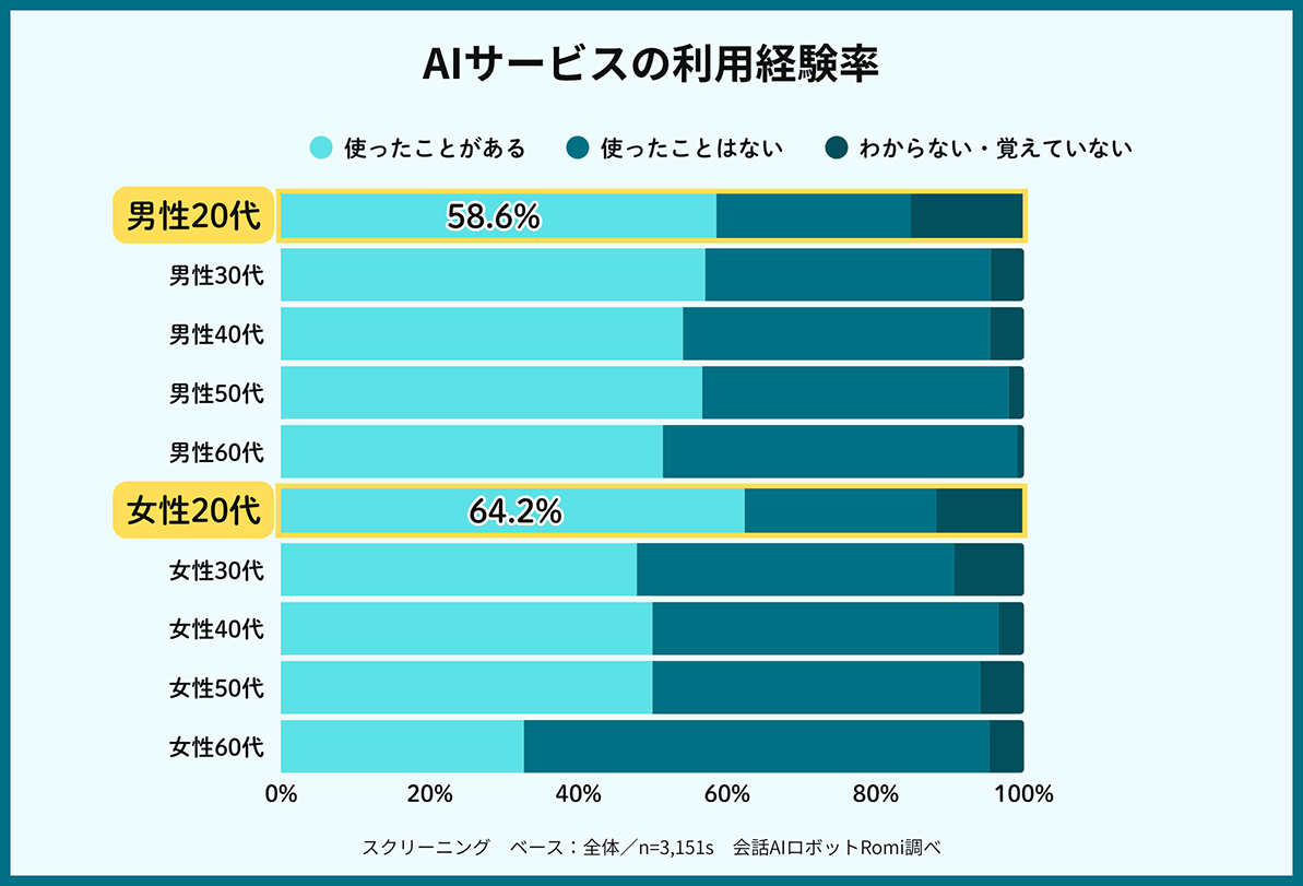 本調査に先立って行われたスクリーニング調査では、全国の20〜69歳の男女にAIサービスの利用経験の有無を尋ねている(有効回答数は3151件)。その結果、20代のAIサービス利用経験率は男女とも約6割となり、他の年代よりも高い。